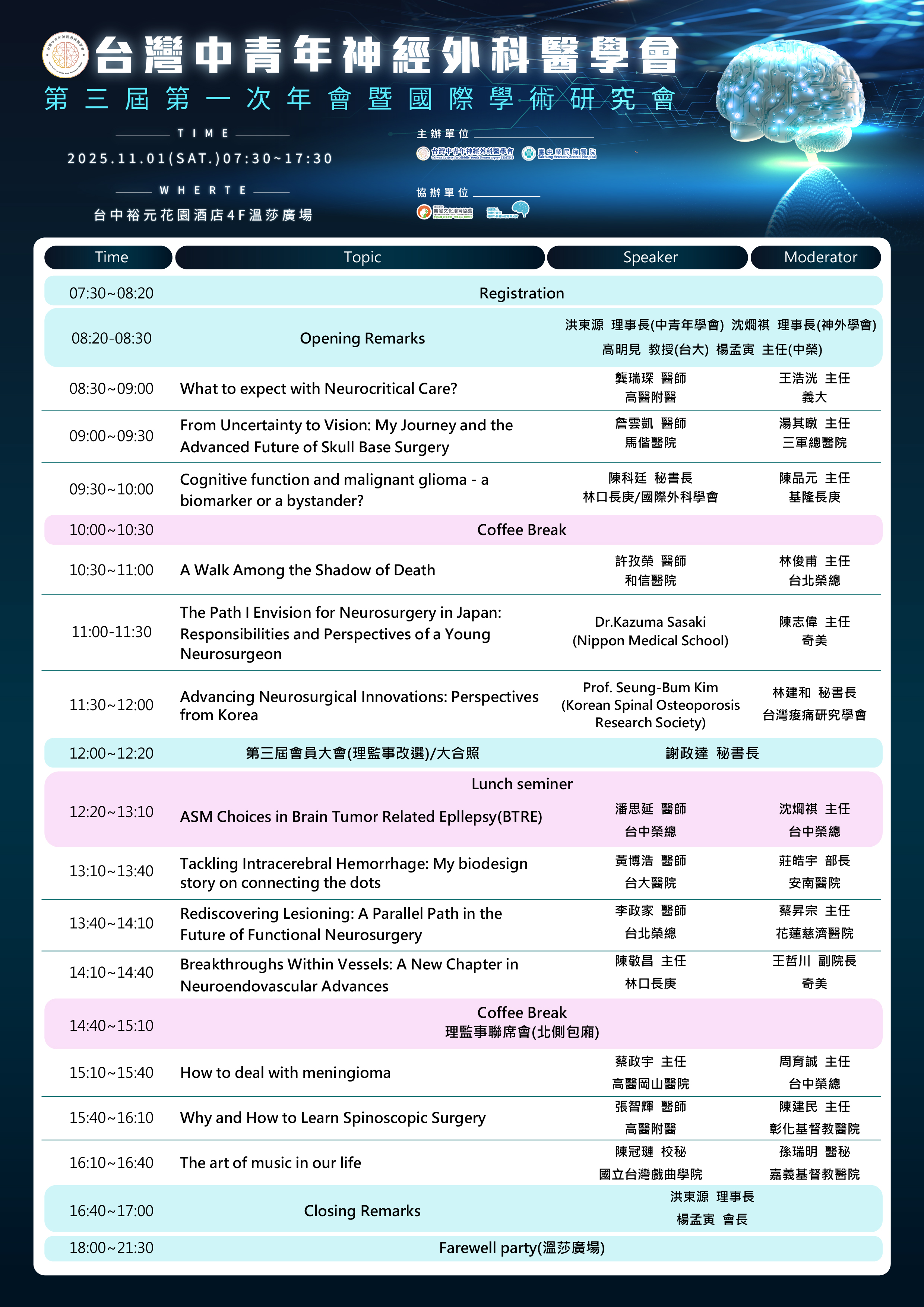 台灣中青年神經外科醫學會訂於民國114年11月1日(六),假台中裕元花園酒店4樓溫莎廣場舉辦本學會第三屆第一次年會暨國際學術研究會,